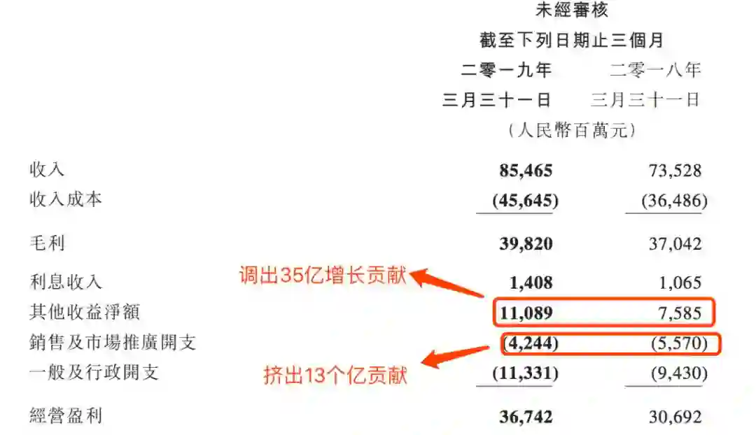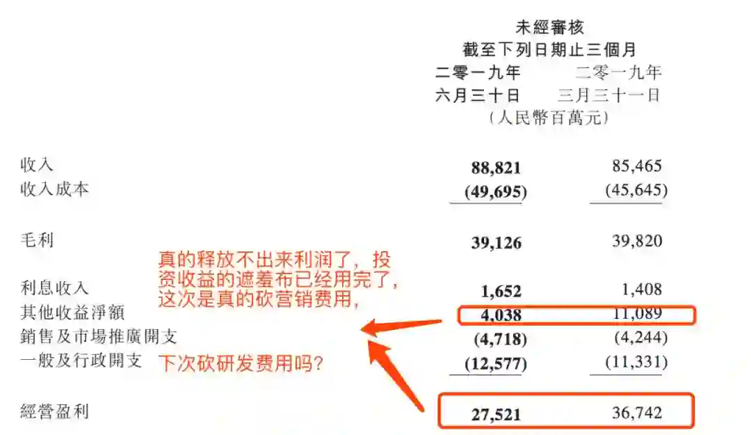 营收不如要预期,就疯狂挤利润,投资收益去年就用完了,这次把营销也用的差不多了。下次呢,用啥?难道是研发费用吗?