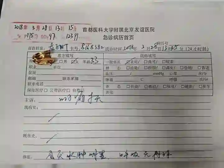 突然发现呼吸有声音了,几次深呼吸后,感觉到呼吸不那么通畅了,心有些慌了,决定继续回友谊医院急诊科,于是按铃,拔针.....离开宣武中医院。