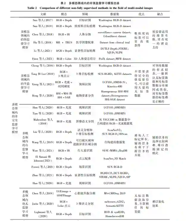 2)缺乏强监督标注信息的方法。 由于数据标 注过程会产生高额的成本,较难获取所有模态的全 部真值标签对模型进行强监督学习。 常见的非完全 监督的方法有基于弱监督、无监督、半监督和自监督 的学习方法,这些方法可以有效改善模态缺乏标注 信息的问题,大大减少人工标注成本。