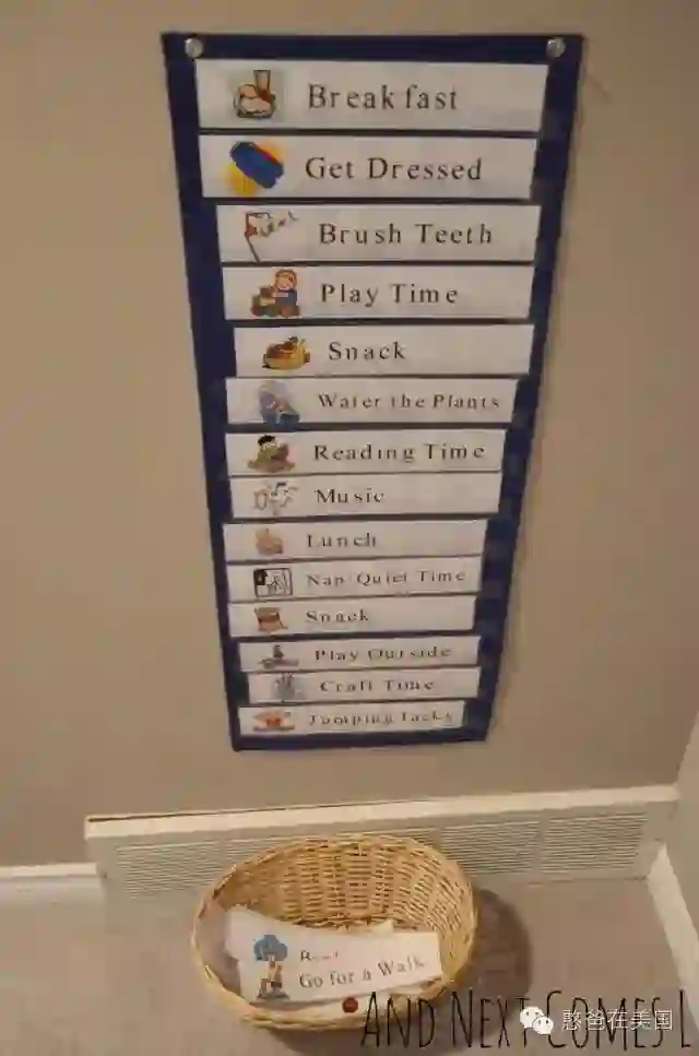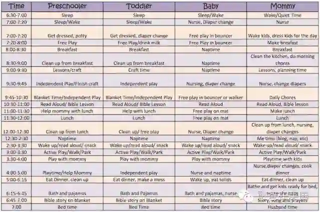 最常见的就是,以时间轴为单位,把每天什么时间段该做什么事情都一条一条地罗列下来,从早上起床开始到晚上睡觉结束。日程表贴在墙上,方便时时参照!