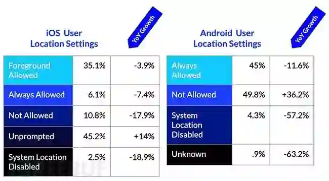 移动端操作系统对于位置共享的态度也各不相同。Android系统在权限许可方面的选择要更少一些,但尽管如此,选择不共享位置信息的用户也增长了36%,iOS端则是降低了18%。