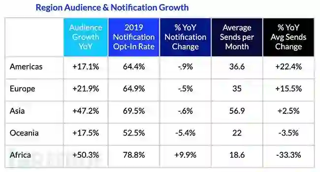 GDPR施行一年以来,尽管营销人员为了满足传统渠道(也就是电子邮件)的新监管要求而减少了客户数量。移动应用程序受众仍在不断增长——同比增长16%。企业方面也推送了更多的信息——平均每个用户每月36次,同比增长18.4%,全球范围内的应用程序通知到达率高达67%。