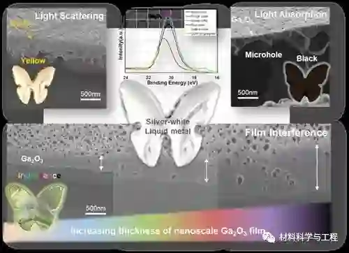 研究表明,镓基液态金属的变色是由于其表面产生了百纳米厚的三氧化二镓介孔薄膜,其色彩来源有干涉和散射两种形式(图1)。当放置在石墨基底上并与电解质溶液中的铝箔混合时,由于三氧化二镓薄膜的瑞利散射和薄膜-金属界面出现的微纳米空腔,液态金属表面上出现银白色到金色最后到黑暗的颜色变化。