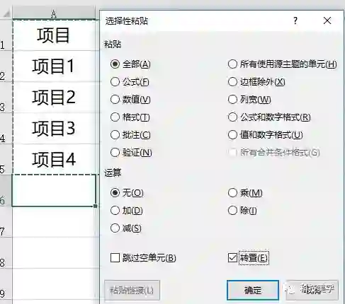 (3)在弹出的“择性性粘贴”设置框中,找到“转置 ”选项并选中打钩,之后点击确定互换完成。