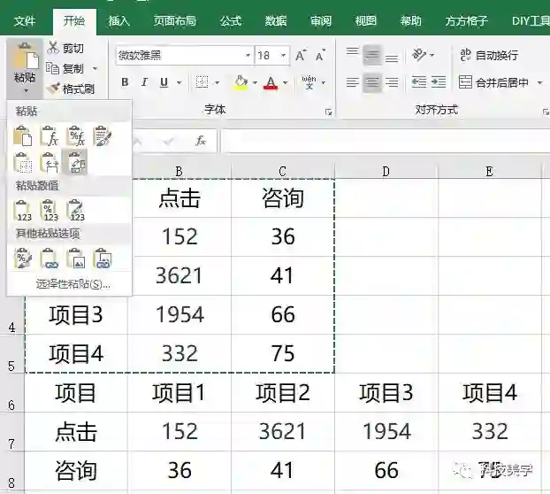 (2)粘贴后的数据右下角会出现一个“粘贴选项”图标,点击这个图标。弹出具体的选项设置,找到“转置”图标并点击,返回到工作表界面后行列互换成功。
