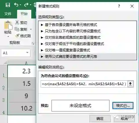 (2)这个时候会打开“新建格式规则”对话窗口,选择规则类型中的“使用公式确定要设置 格式的单元格”,并在”为符合此公式的值设置格式“输入框中输入这两个公式=or(max($A$2:$A$6)=$A2,min($A$2:$A$6)=$A2);