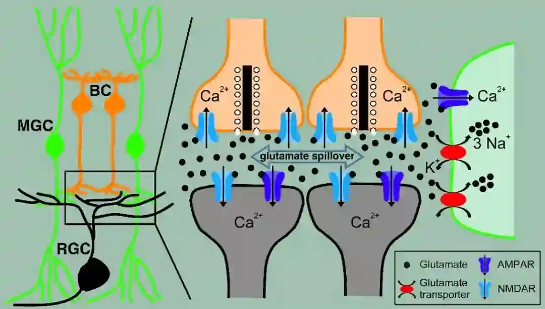 图注:通过NMDA自受体的激活,双极细胞轴突末梢自发释放大量谷氨酸,其在内网状层中以波状方式扩散,并通过激活AMAP受体,使得神经节细胞产生视网膜自发活动波。同时,穆勒胶质细胞通过AMPA受体可检测到视网膜自发活动波的发生,并通过谷氨酸转运体调节视网膜波的发生和传播。