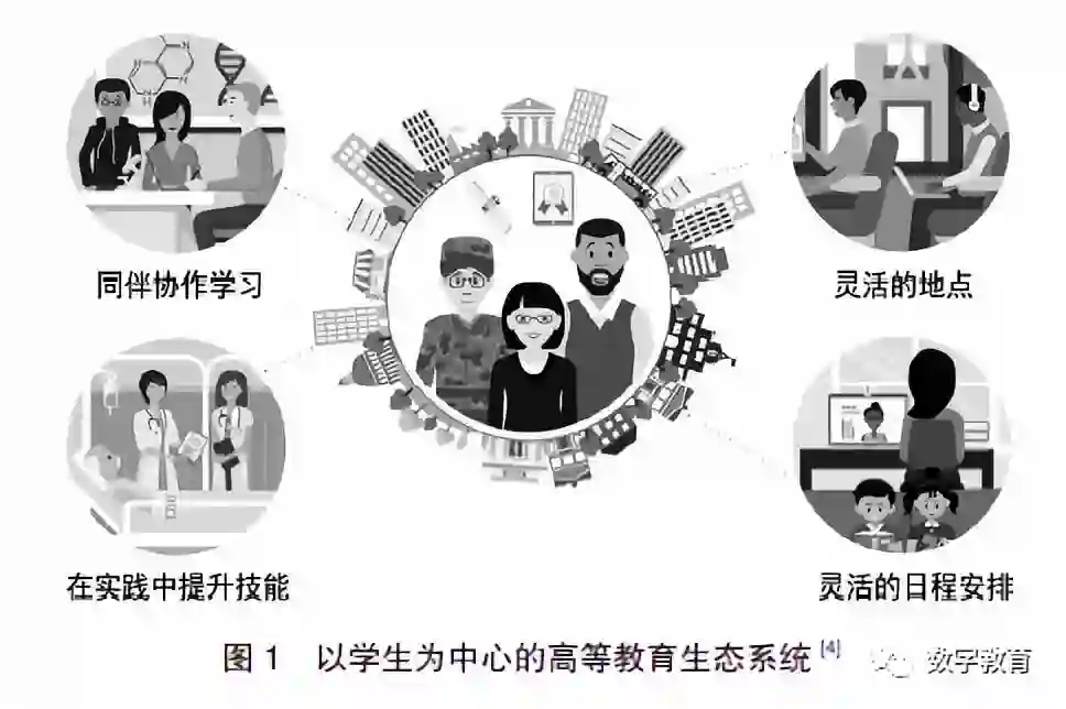 图1 描述了一个以学生为中心的高等教育生态系统。学习对于这个生态系统的学生来说是终身的,它不仅发生在教育环境中,而且还发生在多种情境中,如社区或非传统教育机构、家里、工作地点及可以通过移动和便携技术开展学习的任何地方。
