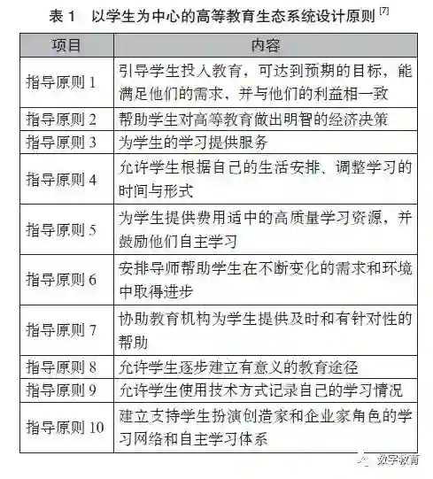 高校学生需要一个灵活、整合、高效并且费用适中的生态系统。机构、教师和教育管理者应制定满足学习者需求的政策制度,并且要兼顾传统和现代两种结构、方案和机构设置[6]。表1 中10 条指导原则可以指导相关人员构思和创建这样一个生态系统。