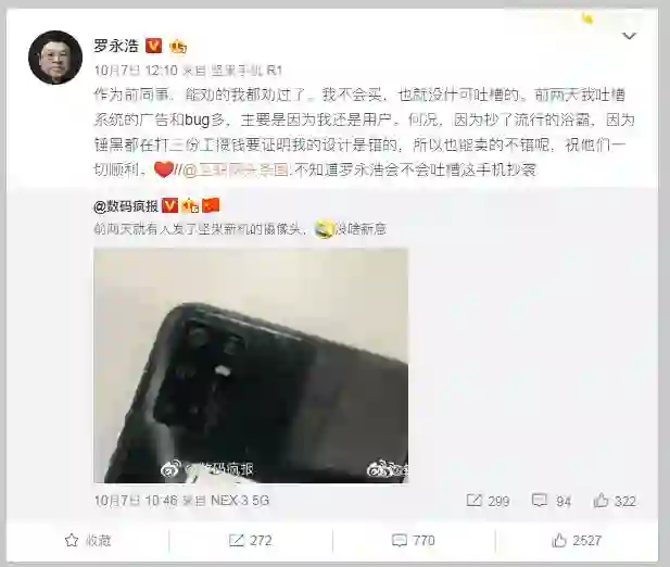 但对新手机老罗显然不满意,发售前,就在微博上直言“不会买”,“系统广告和 Bug 多”,并且直接开怼浴霸设计。