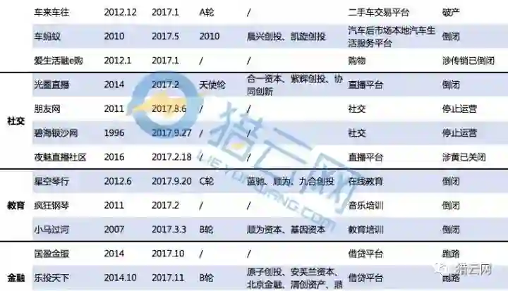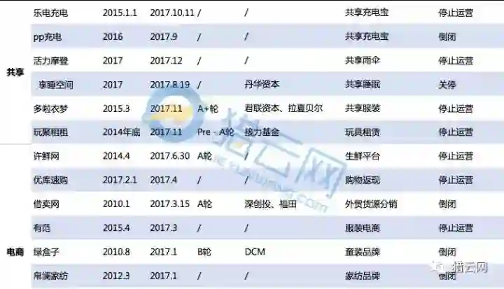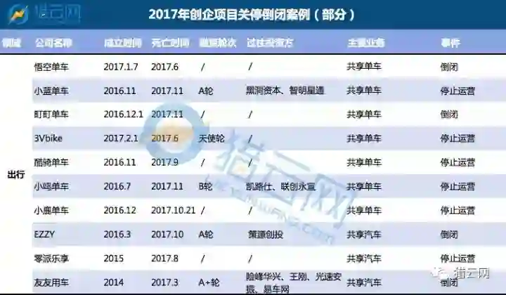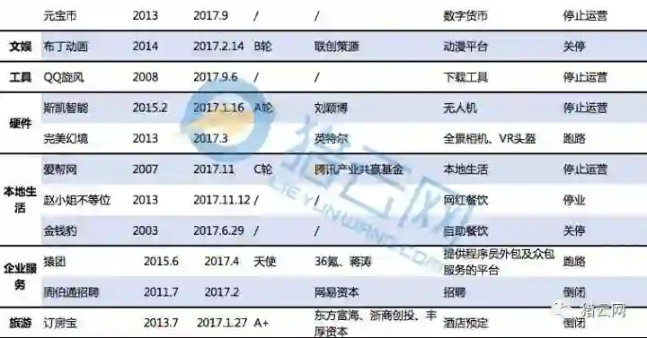 从表格中可以看出,今年比较热门的出行、共享、电商等领域的项目开始倒闭。