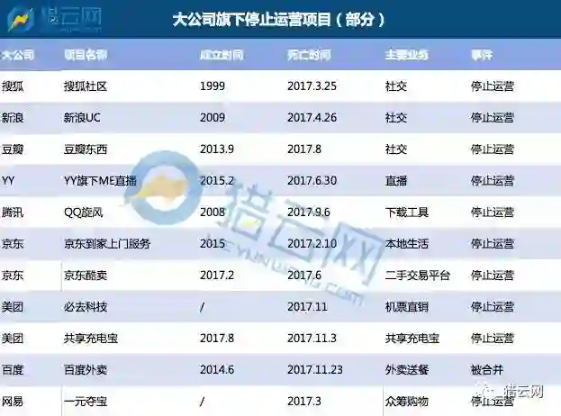 大公司旗下停止运营项目梳理