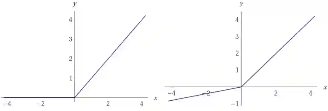 激活函数:ReLU(左),Leaky ReLU(右)。请注意,当 x 为负值时,Leaky ReLU 有一个很小的斜率。