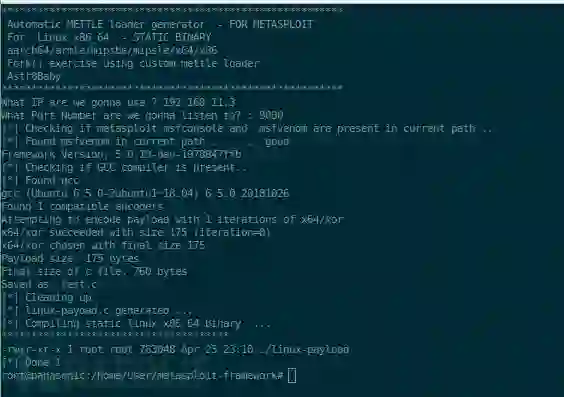 我将重点关注使用各种编码器组合的Linux x86 和 x86_64 Meterpreter/Mettle payloads。shell脚本生成器包含可以更改的变量名称,以使用喜欢的组合和自动生成二进制文件的进程。