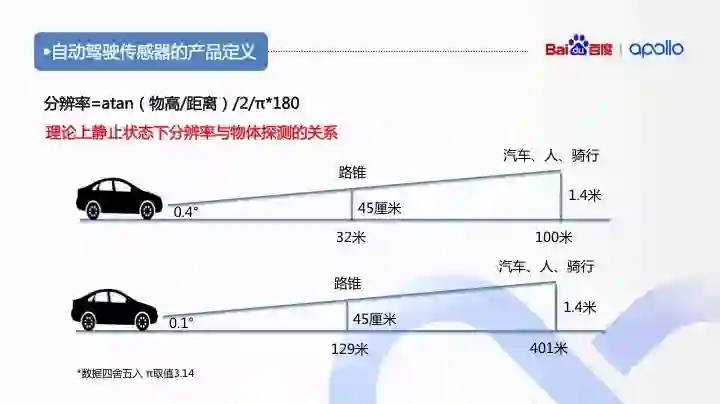 理论上分辨率 0.4 度时 100m 外就可以探测到一辆车,而在 0.1 度分辨率下 400m 外就能探测到。但检测只是识别到有个物体并不代表能识别,从自动驾驶的算法角度来讲,比如激光雷达物体识别需要 4 到 5 条线扫描上才能识别出物体的类别。从这个角度看自动驾驶系统如果用 0.4 度分辨率的激光雷达在 50m 范围内才能真正识别出一辆车。