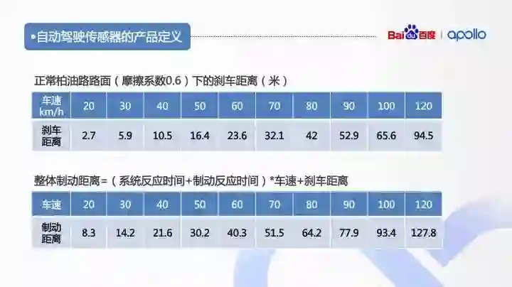 自动驾驶要求局限于车辆的 ODD(Operational Design Domain),即设计适用范围。城市道路 + 城际高速是自动驾驶汽车普遍的适用范围。我国城市封闭道路最高限速 80 公里/小时,高速公路限速 120 公里/小时。干燥的柏油路面摩擦系数是 0.6,根据刹车距离公式:S=V*V/2gμ 去计算刹车距离得出第一行的表格,再结合自动驾驶系统反应时间和制动系统反应时间得出下表。