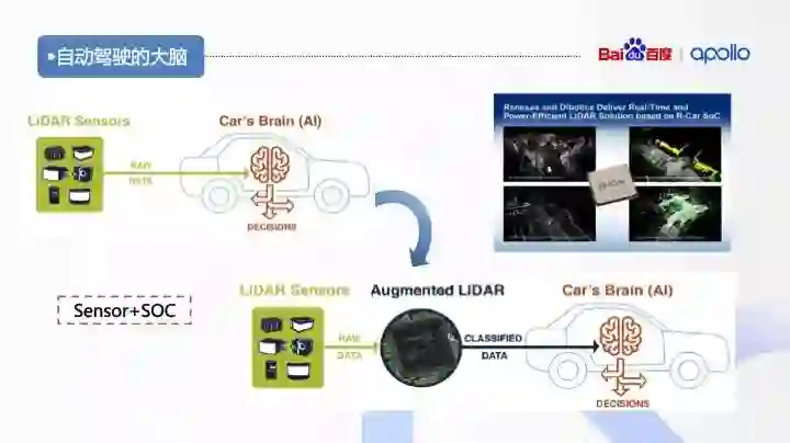 激光雷达处理需要高效的处理平台和先进的嵌入式软件。如图 Renesas 将包含高性能图像处理技术及低功耗的汽车 R-CarSoC 与 Dibotics 的 3D 实时定位和制图(SLAM)技术相结合,提供 SLAM on Chip™。SLAM 可在 SoC 上实现高性能所需的 3D SLAM 处理。Dibotics 公司也开发了一款名为“Augmented LiDAR”的嵌入式 LiDAR 软件,能够提供实时、先进的 LiDAR 数据处理。