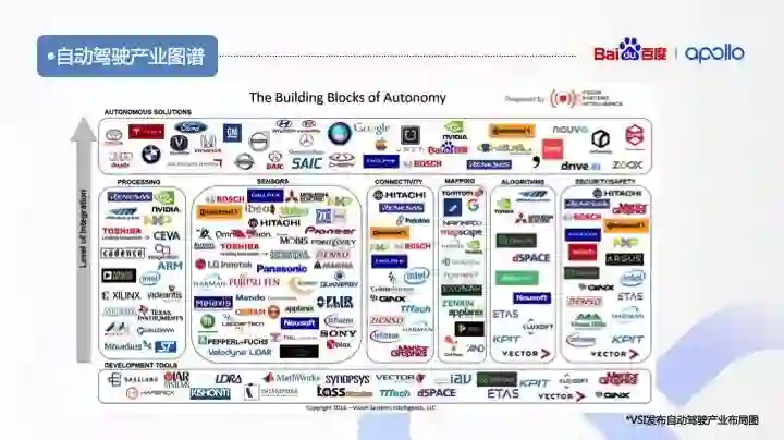 从 VSI 发布自动驾驶产业布局图中可以看出自动驾驶产业,是汽车、新能源、IT 通讯、交通运输、半导体、人工智能、互联网等多个 10 万亿巨无霸产业的跨界融合体。自动驾驶汽车是物质流、能量流、信息流的聚合体,需要行业各方深度合作,只有软硬件深度整合,打通藩篱跨界的企业才能摘得皇冠上的明珠。