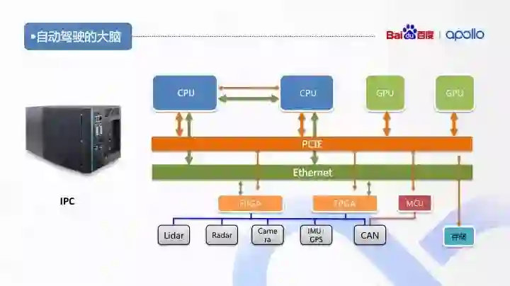 整体架构设计需要考虑 ISO26262 的要求,CPU、GPU、 FPGA 以及总线都做冗余设计,防止单点故障。当整体 IPC 系统失效还有 MCU 做最后的保证,直接发送指令到车辆 Can 总线中控制车辆停车。