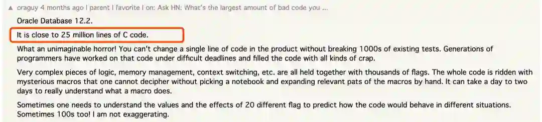 Oracle 12.2这个版本,有将近2500万行C代码!(相比较而言,最受欢迎的NoSQL数据库Redis最新版本5.0.4也不过2万多行代码,真是短小精干。)