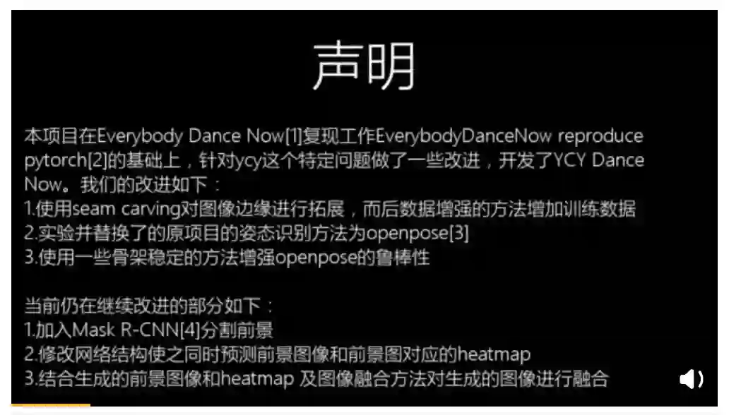 技术原理:基于 pix2pixHD 生成对抗网络和时域空间平滑的运动转移方法。使用姿势检测作为用户舞蹈和杨超越舞蹈之间的中间表示,学习从姿势图像到杨超越主体外观的映射。
