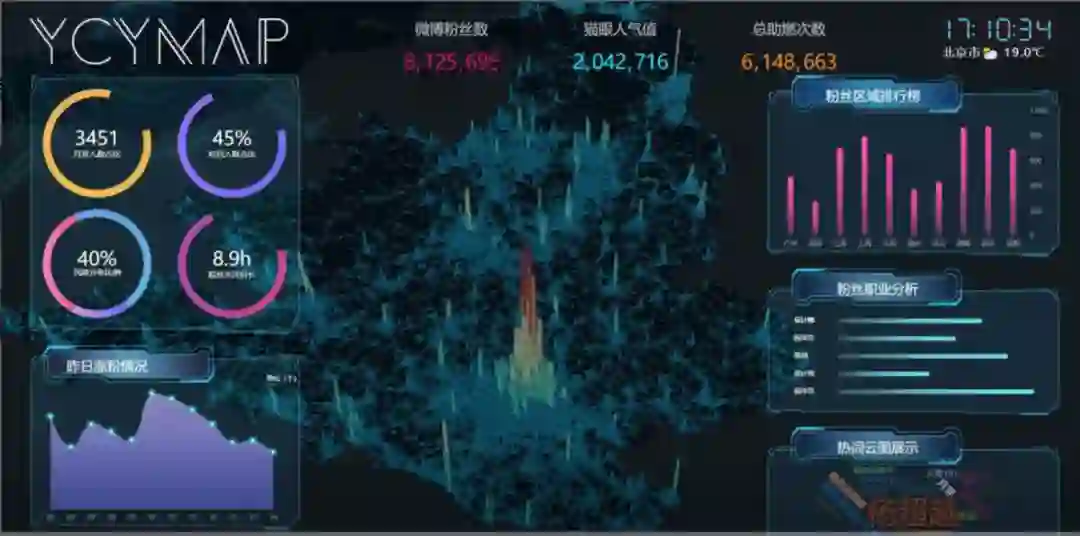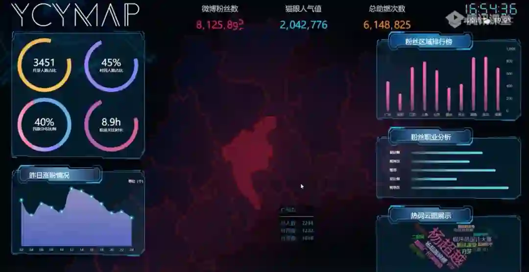 在这个地图中,首先在左侧可以看到一些基本数字,微博粉丝数、猫眼人气值及总助燃次数;每日涨粉趋势、名族与男女占比;关于粉丝更详细的信息可以了解到粉丝所在区域的情况、粉丝职业分析及热词云图等。