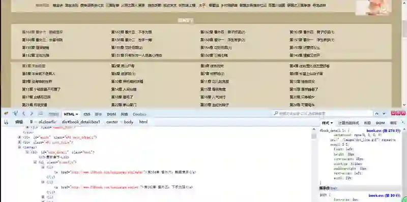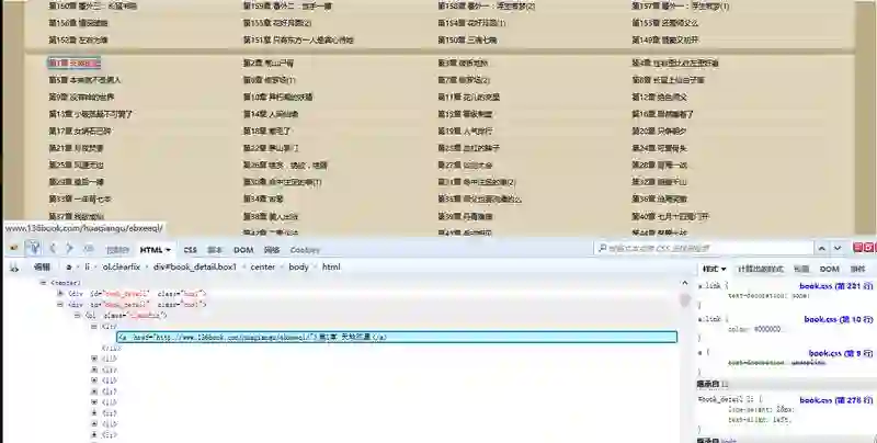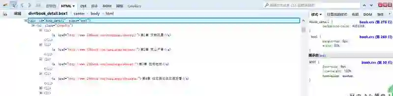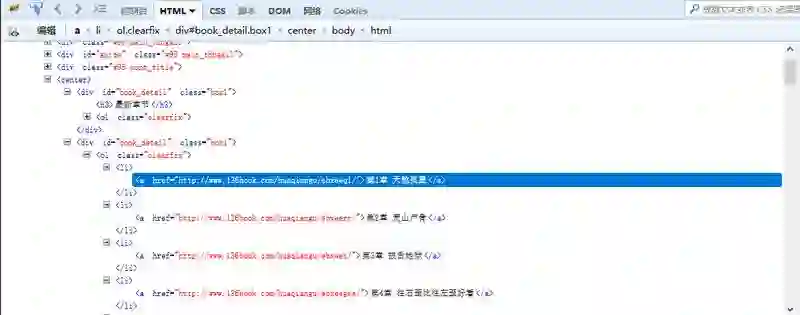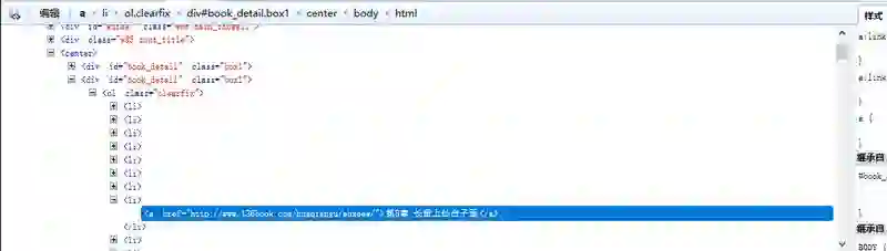 这样我们可以看到,每一章的链接地址都是有规则地存放在<li>中。而这些<li>又放在<div id=”book_detail” class=”box1″>中。