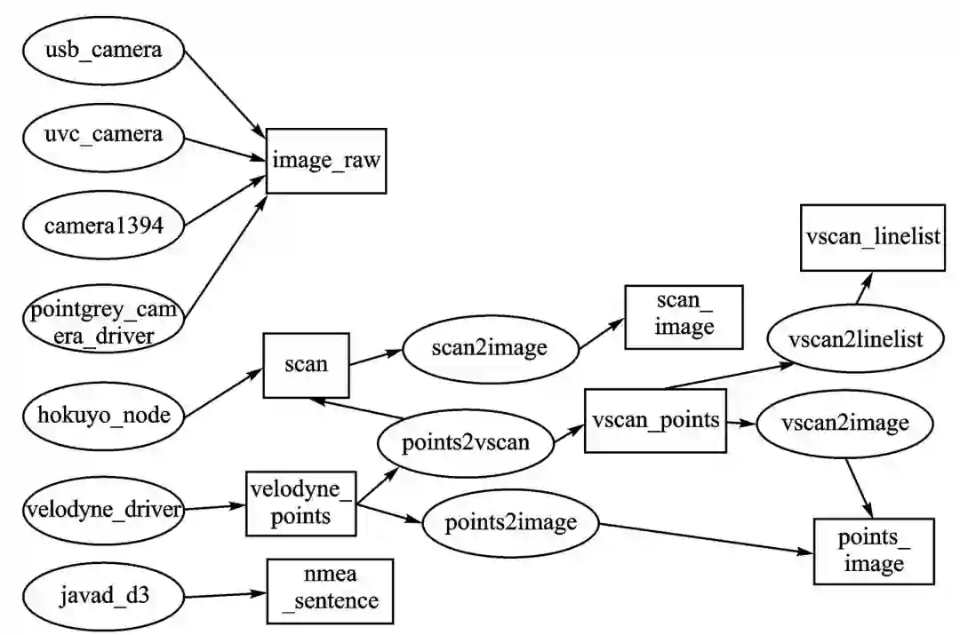 机器人操作系统(ROS)满足上述这些要求。在 ROS 系统中,通过将系统抽象成节点和主题,其中节点用于表示单个组件模块,主题用于保存输入和输出节点之间的数据,形成强大的抽象模型组件扩展计算框架,可以方便进行无人驾驶系统的开发。