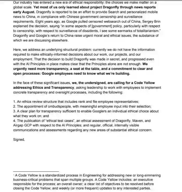 这封信说:“我们迫切需要更多的透明度,明确在这件事上的位置,以及对清晰和开放流程的承诺:谷歌员工需要知道我们正在建设什么。”
