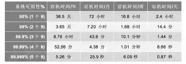这个公式就是计算系统可用性的,也就是我们常说的,多少个 9,如下表所示。
