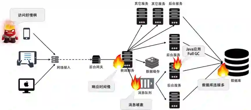 在今天来说,一个分布式系统的故障已经非常复杂了,因为故障是分布式的、多米诺骨牌式的。就像我在《分布式系统架构的本质》中展示过的这个图一样。