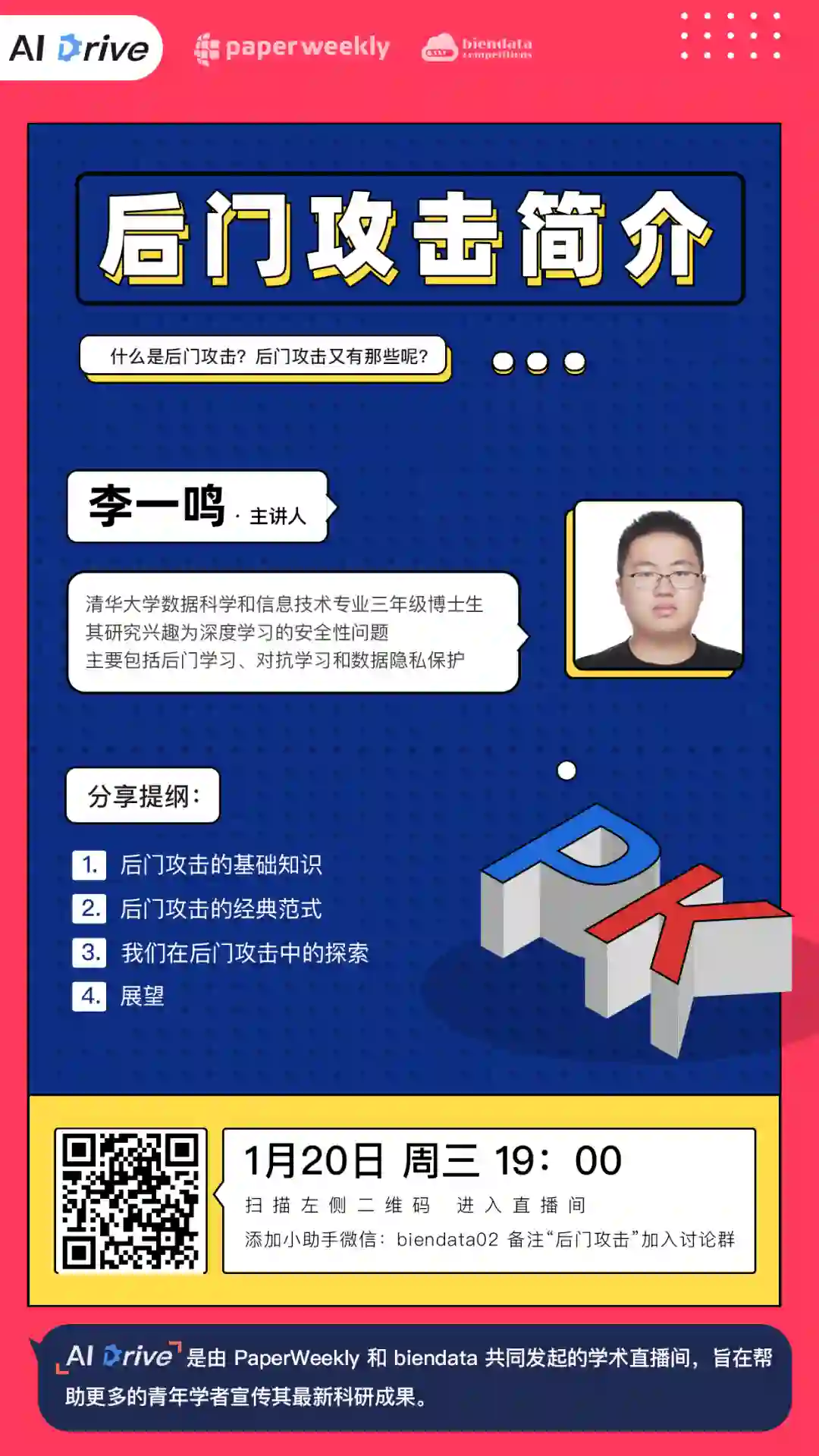 本期 AI Drive,我们邀请到清华大学博士生李一鸣,为大家带来后门攻击简介的专题直播。对本期主题感兴趣的小伙伴,1 月 20 日(周三)晚 7 点,我们准时相约 PaperWeekly B 站直播间。