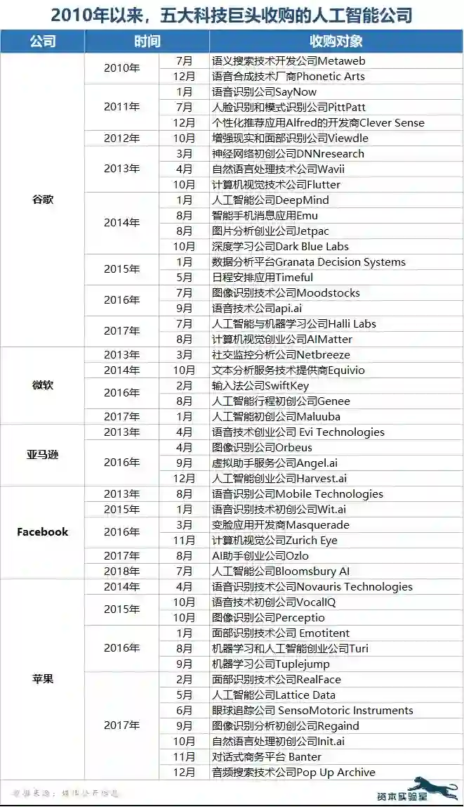 在收购方面,谷歌同样最为活跃,其次是苹果公司。