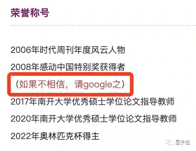 胡教授说,曾经还获得过“2006年时代周刊年度风云人物”和“2008年感动中国特别奖获得者”,他在这条下面特别标注道: