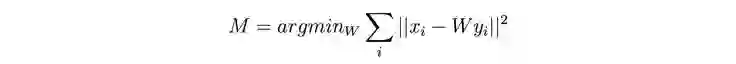 我们利用矩阵将嵌入投影到共同空间。该矩阵被用于最小化词嵌入 x_i 和它的投影 y_i 之间的距离。即,如果词典由(x_i,y_i)对构成,我们需要选择投影器 M,使得: