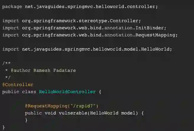 这里有一个控制器 ( HelloWorldController),当它被加载到 Tomcat 中时,它将为 http://name/appname/rapid7 中处理 HTTP 请求。处理请求的函数被称之为 vulnerable,而且还有一个 POJO 参数 HelloWorld。在这里,HelloWorld 被简化了,但如果需要,POJO 可能会变得非常复杂 :
