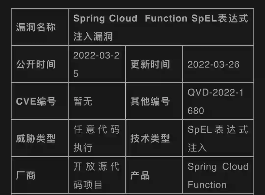 3 月 26 日,据网络安全网站 Cyber Kendra 报道,Spring Cloud Function 官方测试用例曝光了 Spring Cloud Function SPEL(Spring Expression Language)表达式注入漏洞,黑客可利用该漏洞注入 SPEL 表达式来触发远程命令执行。