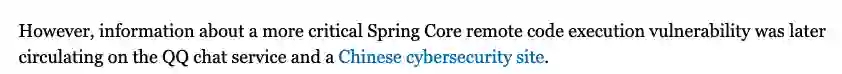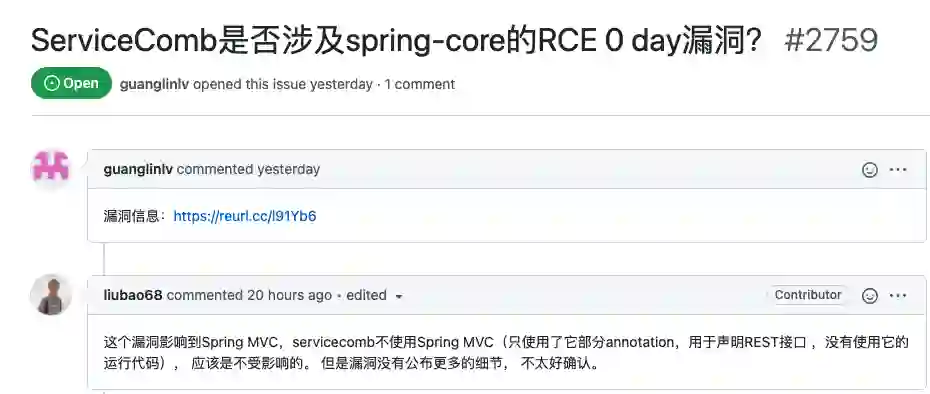 目前由于 Spring 官方尚未发布最新说明,无法确定哪些应用程序使用了有漏洞的功能,这也导致但凡和 Spring 沾点关系的功能,开发者都要问上一句「是否涉及 Spring Core 的 RCE 0day 漏洞」。