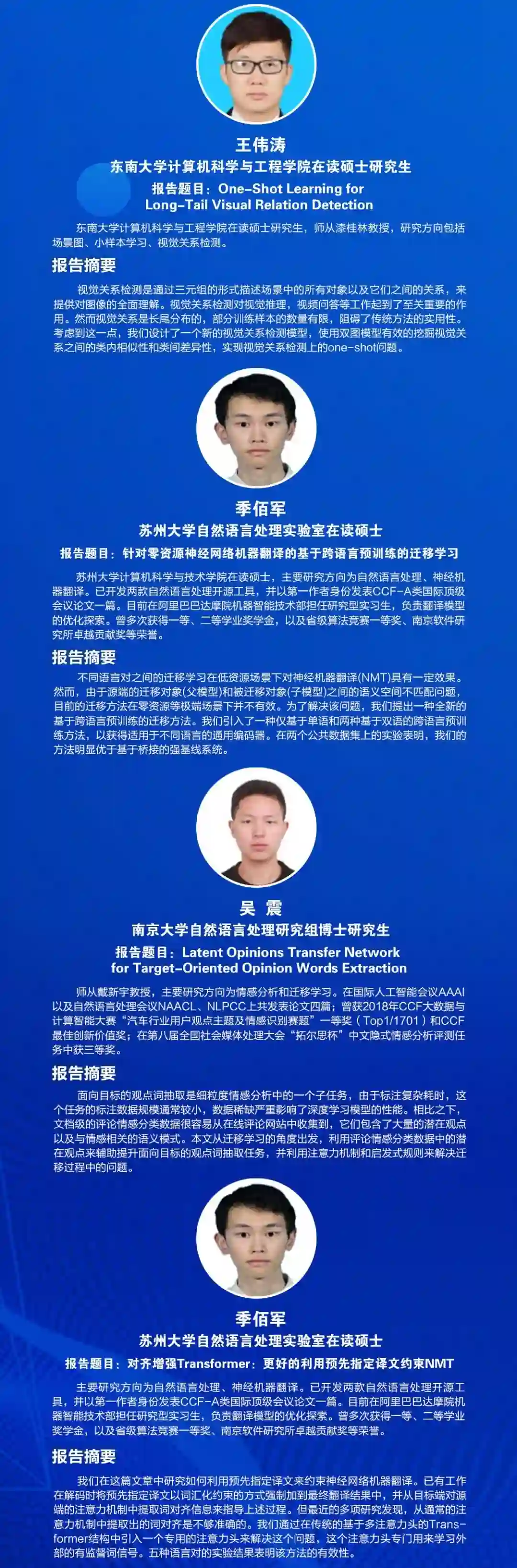 周国栋教授,1997年12月毕业于新加坡国立大学获得博士学位;1998年1月至1999年3月在新加坡国立大学从事博士后研究;1999年4月-2006年8月在新加坡资讯通信研究院分别担任副研究员、研究员和副主任研究员;2006年8月底加入苏州大学担任教授博导,组建自然语言处理实验室。研究方向:自然语言理解、信息抽取、自然语言认知等。近5年来,发表国际著名SCI期刊论文20多篇和国际顶级会议ACL/EMNLP/COLING/IJCAI/AAAI论文80多篇,主持NSFC项目4个(包括重点项目2个)。据Google Scholar统计,论文引用超过7000次,曾担任国际自然语言理解领域顶级SCI期刊Computational Linguistics编委,目前担任ACM TALLIP副主编、《软件学报》责任编委、CCF中文信息技术专委会副主任委员、苏州大学学术委员会委员。