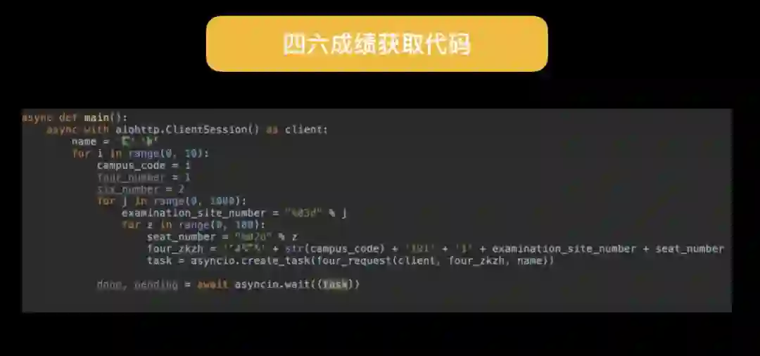 知道学校名称,拥有了学生名单,明白准考证号组成规则,只需几行代码我们就可以去撞任意一位学生的四六级成绩。
