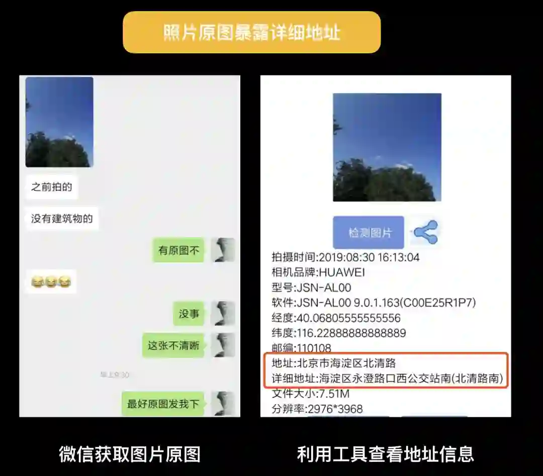 我们继续来看一个大家天天都会使用的软件「微信」,我向自己的好友做了个实验,叫他随意发一张身边的风景照,并用清晰度不高为理由,叫他把原图发给我下。而就是这样不经意的举动他已经把自己的家庭地址暴露给我了。拿到照片之后,我在微信上随意找了个 Exif 信息查询小程序,就得到了他的拍摄时间、详细地址。