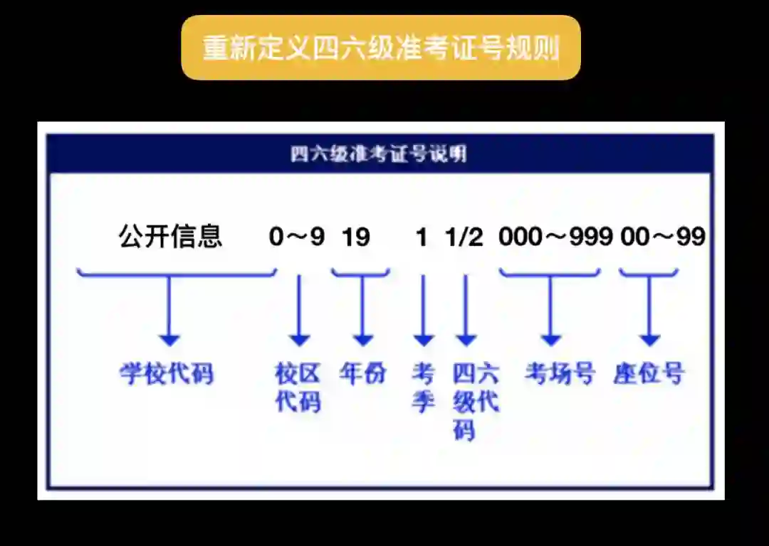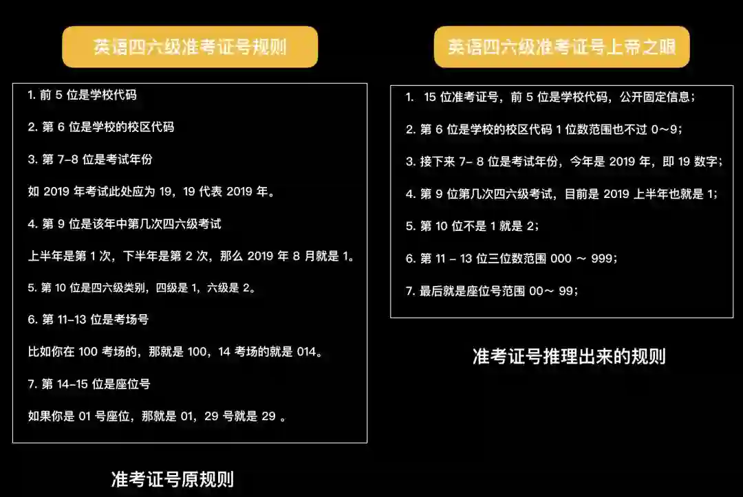 很简单,这世界是由无数种规则组成,知道了规则你就是上帝,俯瞰一切。一场百万新生参与的英语考试,他们的准考证号一定是由某种规则组成的。随后我在网上搜索了四六级准考证号是由什么组成,就得到了非常关键的信息。