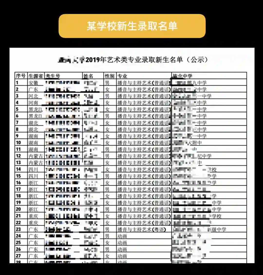 但不管在座的各位是已经出来工作的人士,还是还在上学的学生,想要获取任意一个学校学生姓名的名单,是件和喝水一样简单的事。因为有很多学校会把录取学生的信息,放在自己的官网上。下图就是我在网上随便搜索某个大学,找到的艺术类 2019 新生名单。
