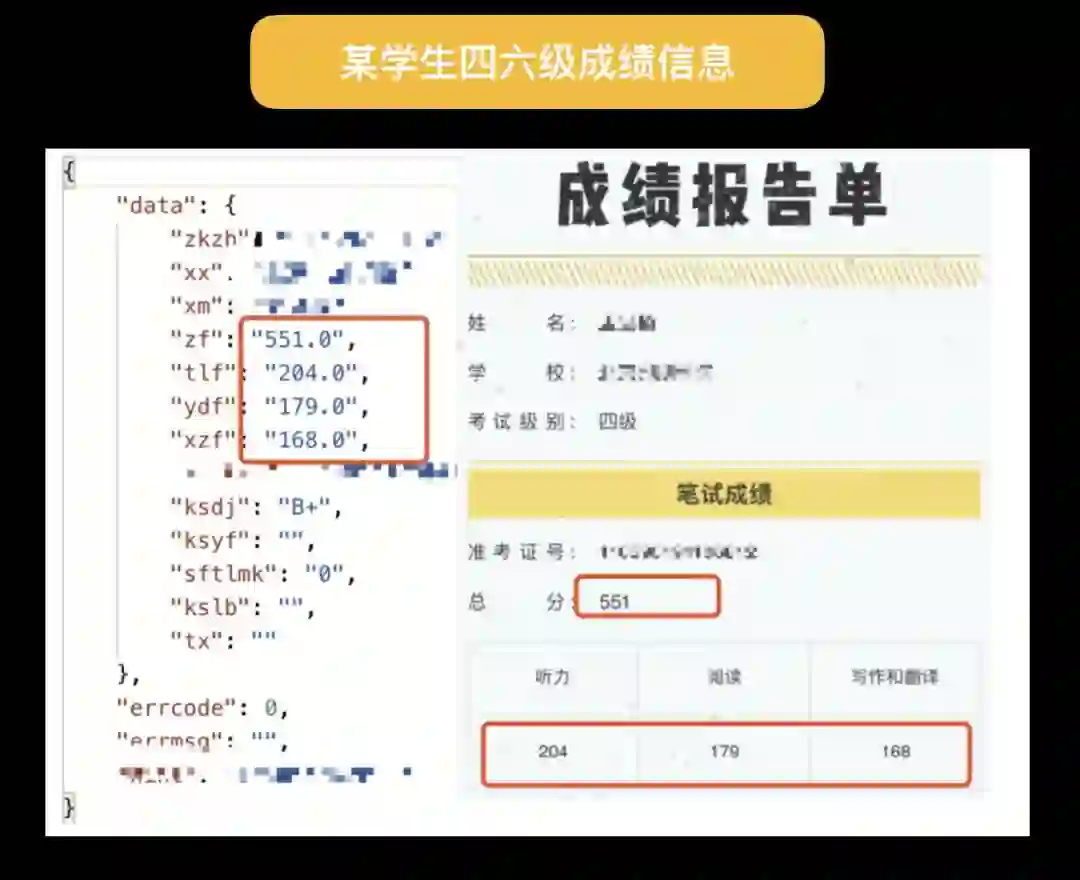 上图是我输入某位同学的姓名和准考证号,发送请求得到的四六级信息,查询到的信息和图片显示完全一致。
