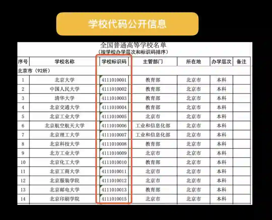 我在教育部网站上找到了全国高等学校名单的 Excel 表,全部都是公开信息任何人都可以下载。而表格中的学校标识码后 5 位就是学校代码。