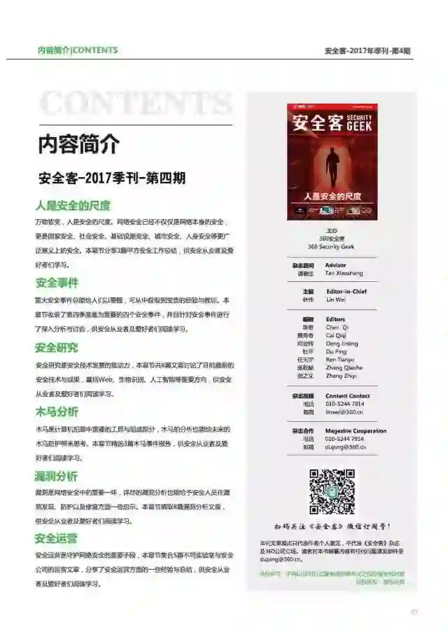 360天眼、360天马、360cert、百度安全实验室、巴斯光年实验室、360 Team Seri0us、360 MeshFire Team、影武者实验室、长亭科技、360GearTeam、360 Vulpecker、腾讯手机管家、360安全卫士等13个安全团队,以及瘦蛟舞、冰刃-suezi、lorexxar、n1nty、zsx、岳良、JoyChou、 tony、廖新喜、银燕冰、yang等技术博客及微信公众号的优质技术文章,才最终汇集而成安全客第四季季刊。