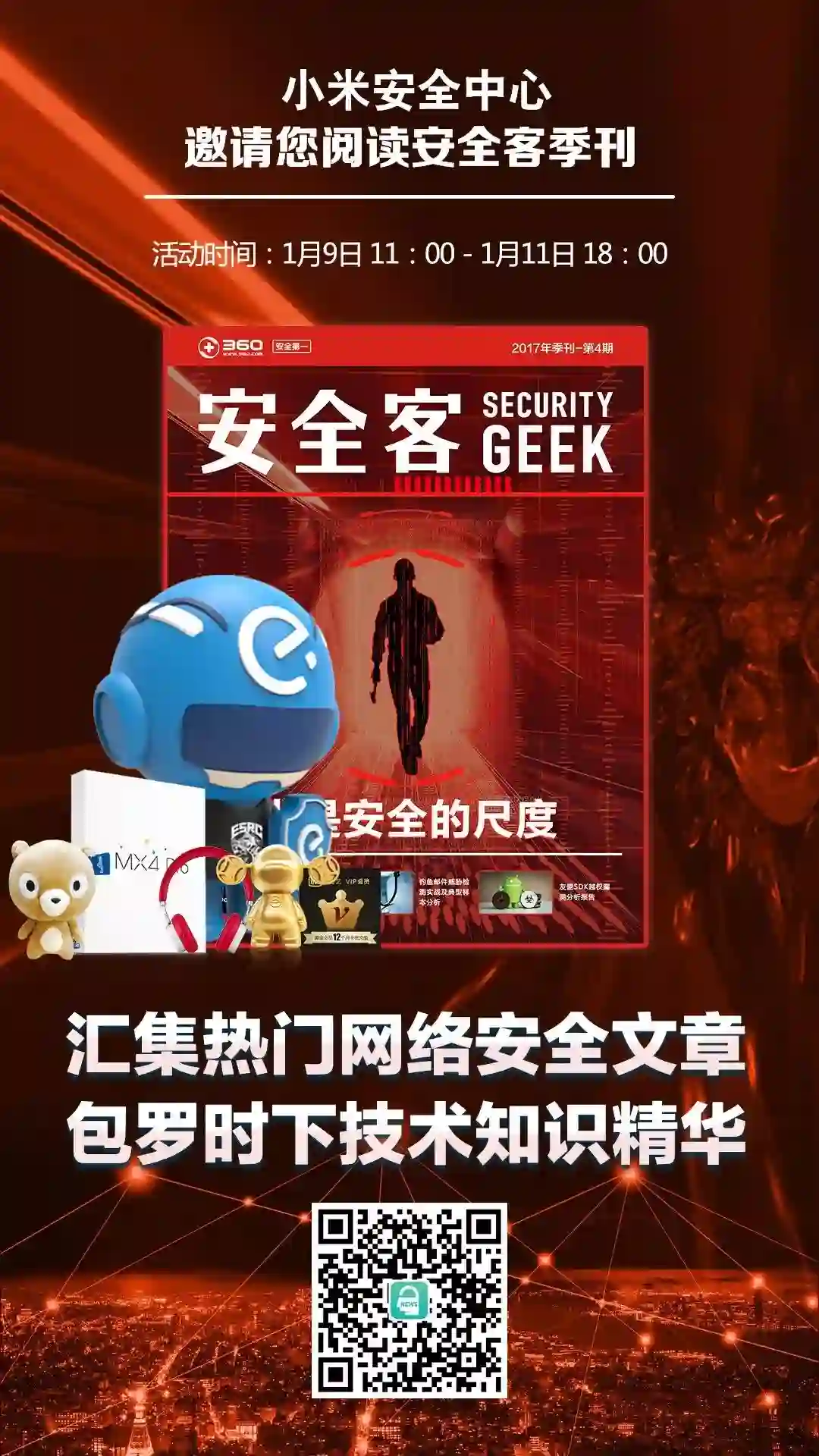 1月9日,安全客2017季刊—第4期将再度上线,我们对文章质量的严格把关始终恪守不渝,只愿为安全爱好者带来最好的干货!从1月9日的11点到1月11日的18点,我们将放送出49家合作伙伴提供的1300份定制好礼。