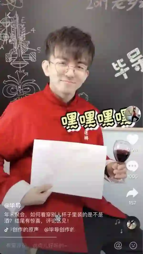 1993年出生的毕导,是清华大学化工系博士生,他给自己的定义是“一个爱开脑洞的科学段子手”,他所拍摄的在西安入住兵马俑主题酒店的vlog短视频,在微博上登上了热搜排行,在微博和抖音上累积粉丝一百多万。