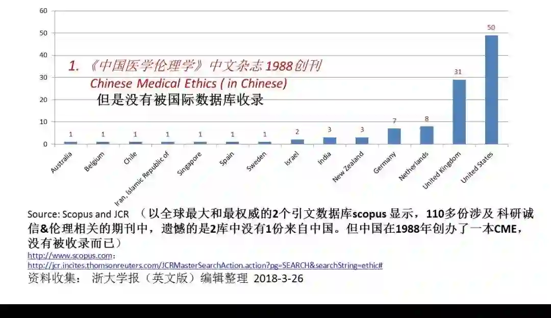 另一组数据也很有说服力,我们对全球最大的两个权威期刊引文数据库(scopus & JCR)搜索发现,以“诚信与伦理”为主题的期刊约有111份,分布在14个国家,其中美国最多50份,英国31份,遗憾的2个大库中没有发现一本中国期刊,其实中国在1988年创办了一本中文的《中国医学伦理学》,但没有被这两个国际权威数据库收录。试想,这些年我们如此注重科研诚信,并强调中国期刊走出去,是否该办一本这个主题的期刊呢?相信这样的期刊与平台对我国的研究生入门教育,科研人员的从业规范一定有指导意义。